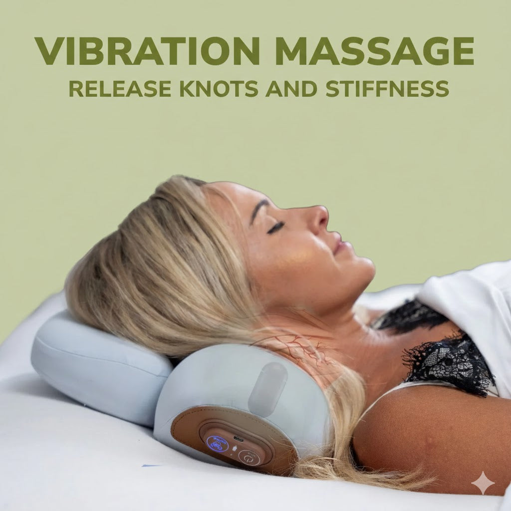 The pillow gently cradles your neck while combining traction, vibration, and heat to release tension, support alignment, and promote daily relaxation all from the comfort of home.